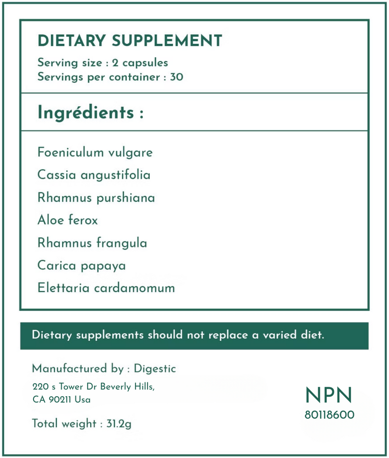 The recommended average is 2 capsules of Digestic™ per day with two large glasses of water. It is possible to start with 1 and then add an additional capsule, up to a maximum of 6 until the desired result is obtained.